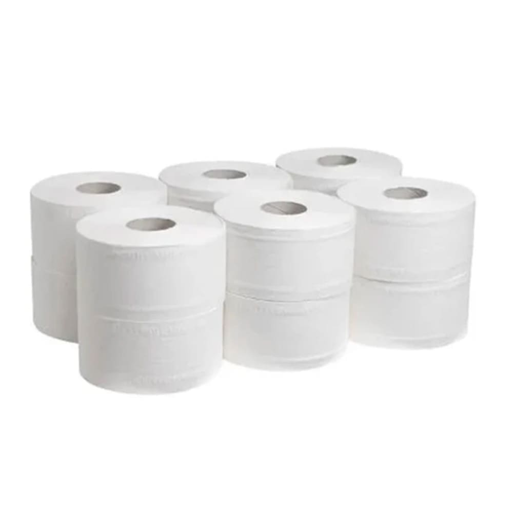 Super soft 2 ply white mini jumbo toilet rolls, ideal for busy washrooms. Durable and long-lasting; supplied in packs of 12 rolls for commercial use.
