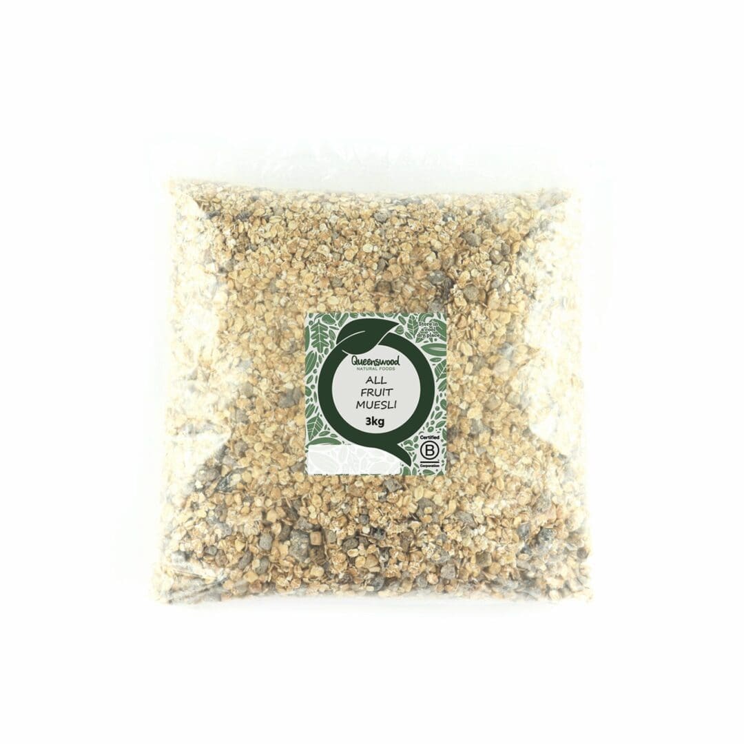 All Fruit Muesli 3kg from Queenswood combines wholesome oats with dried fruits in a nutritious cereal blend ideal for breakfast menus. Packaged for catering use, it pairs well with milk or yoghurt.