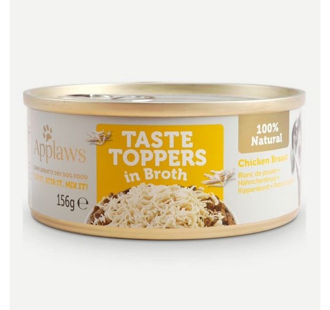 Applaws Taste Toppers Chicken in Broth Tin enriches dog meals with natural wet food, enhancing flavour and nutrition in 12x156g tins. Ideal for fussy dogs.