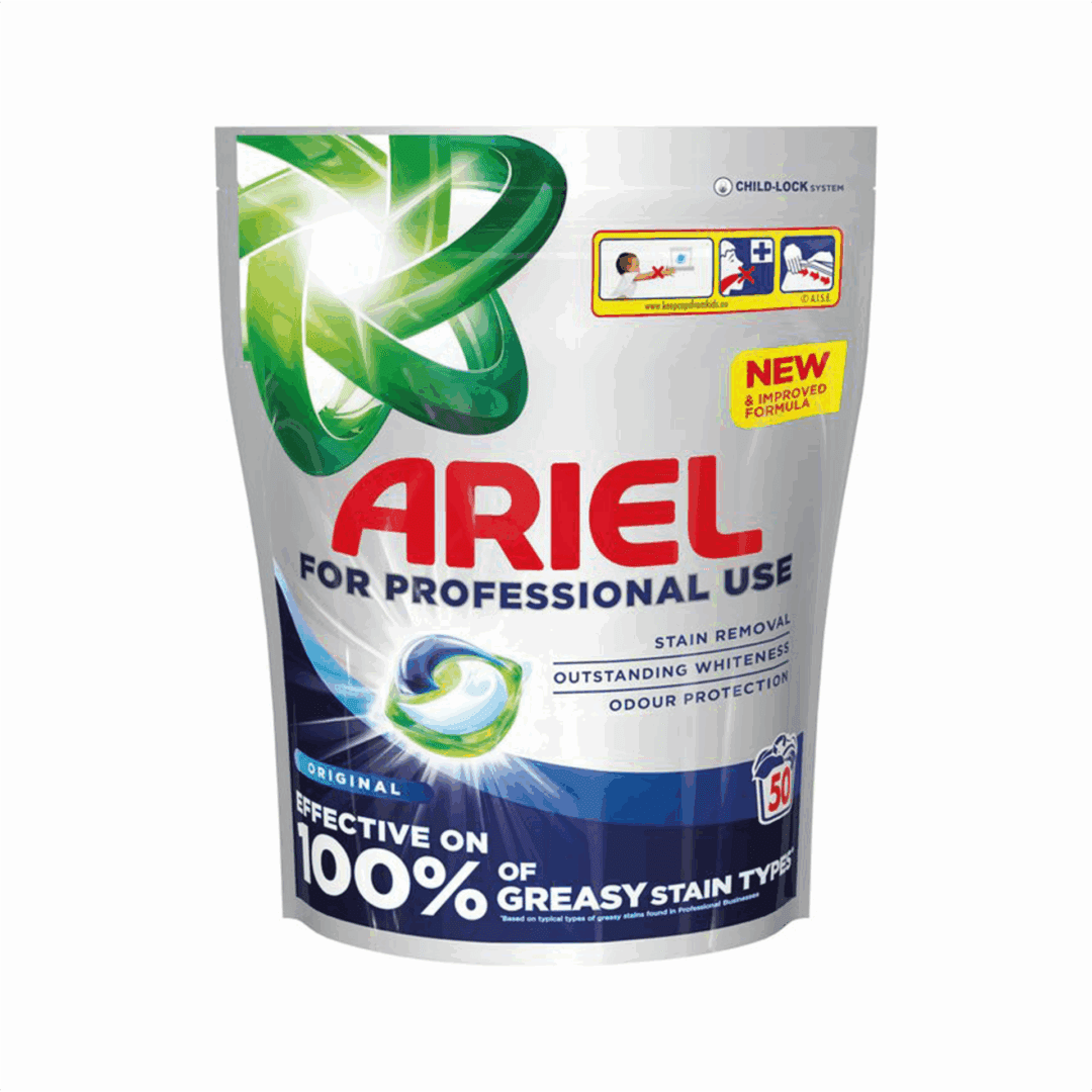 Ariel Professional Liquipods feature a multi-compartment design for powerful, all-in-one cleaning. Ideal for dependable, convenient everyday washing in professional settings.