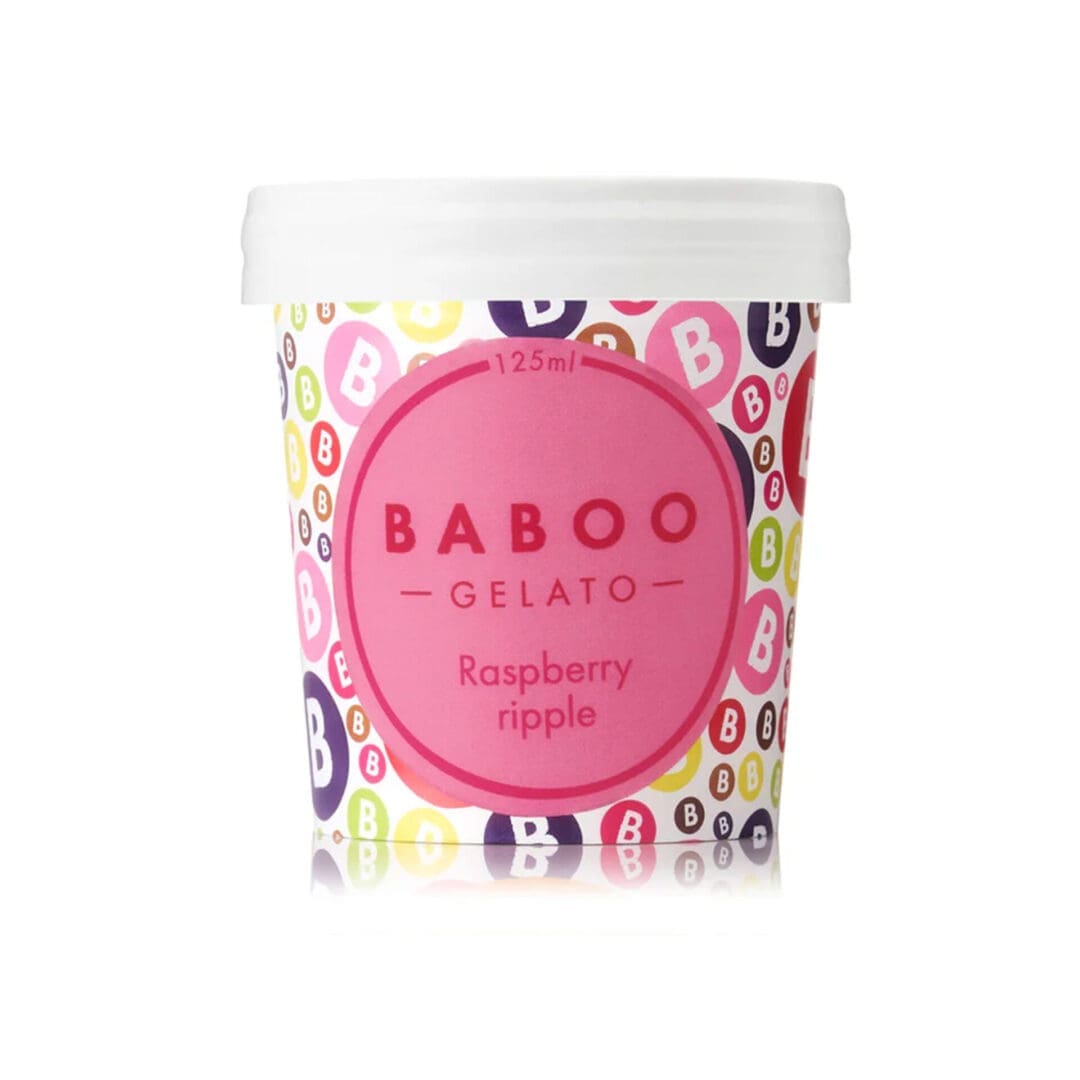 Baboo Raspberry Ripple Gelato Mini Tub blends creamy organic milk and fresh West Country raspberries in convenient 125ml tubs, perfect for café desserts.