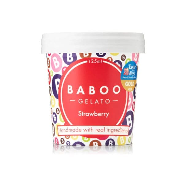 Baboo Strawberry Gelato Mini Tub is crafted from ripe Somerset strawberries, delivering a fresh and intense strawberry flavour in convenient 125ml tubs.