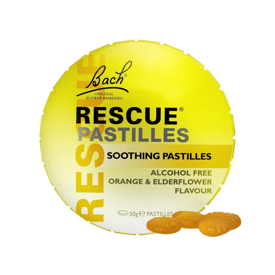 Bulking agents (Sorbitol, maltitol, isomalt), gelling agent (gum arabic), natural flavour (elderflower, orange) sweetener (xylitol), glazing agent (Palm kernel oil, beeswax), flower essences: Helianthemum nummularium, Clematis vitalba,_ Impatiens glandulifera, Prunus cerasifera, Ornithogalum umbellatum (RESCUE®).