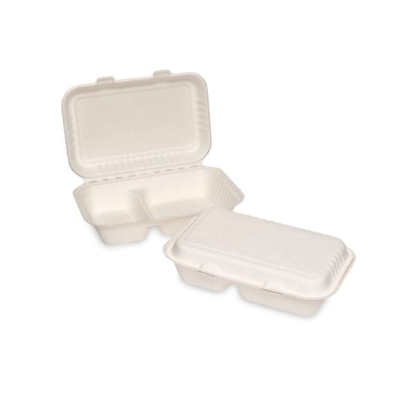 The Bagasse 2x Compartment 9×6 Box is a compostable, biodegradable container crafted from pressed sugarcane residue. Perfect for sustainable food packaging and service.