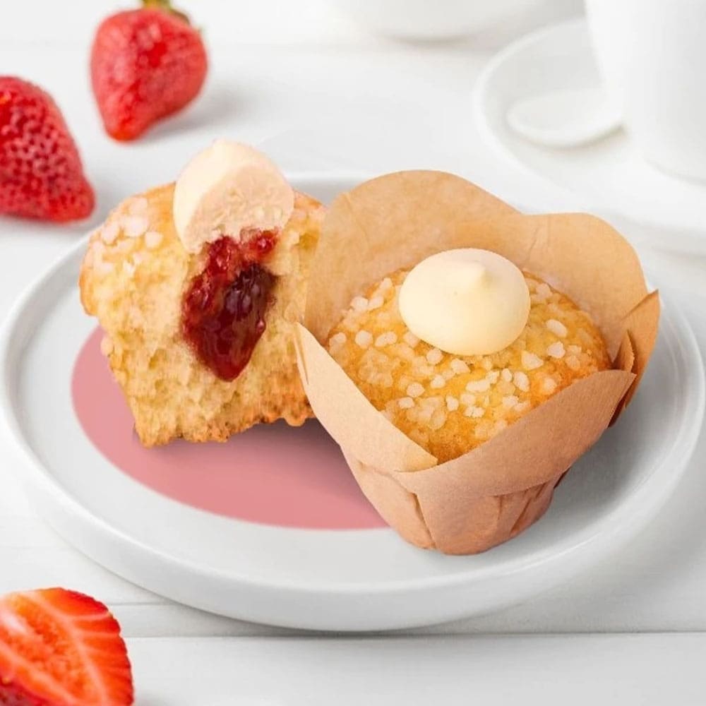 The Victoria Muffin features a vanilla base filled with strawberry jam, topped with clotted cream buttercream and sugar nibs. Pack of 36 x 112g, ideal for gourmet menus.