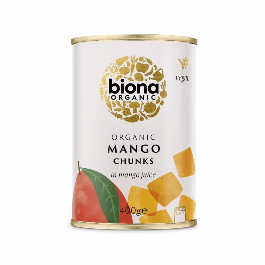 Biona Organic Mango Chunks in Mango Juice, packed in convenient 6x400g tins. Perfect for snacks, desserts or smoothies, delivering natural organic mango flavour.