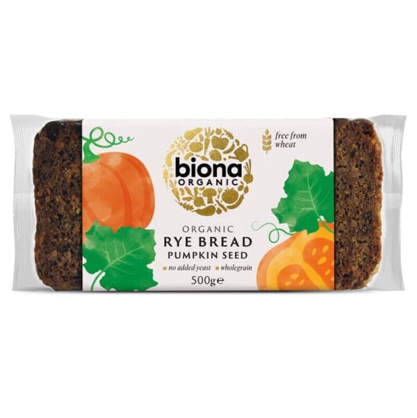 Biona Organic Rye and Pumpkin Seed Bread offers a wholesome 500g loaf, rich in fibre and seeds. Ideal for sandwiches, toasting, or as a healthy bakery choice.