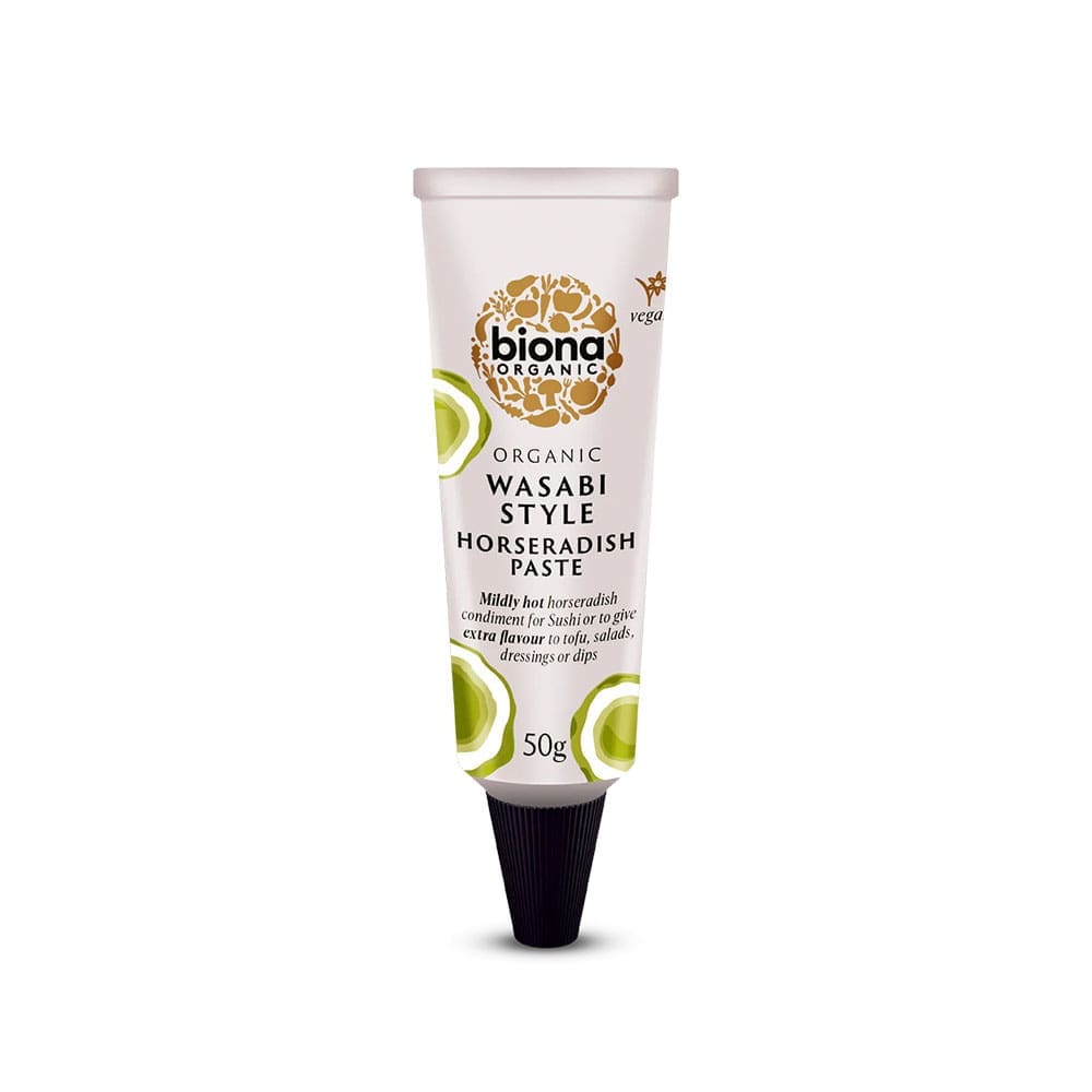 Water, Horseradish* (21%), Mustard seeds*, Vinegar*, Cider Vinegar*, Sea Salt, Shoyu* (Water, SOYA Beans*, Wheat*, Sea Salt, Aspergillus Oryzae), Wasabi Powder* (3%) (Horseradish* (90%), Wasabi (10%)), Apple Syrup*, Rapeseed Oil*, Spices*, Spirulina*, Thickening Agent: Guar Gum*, Essential Mustard Oil Oil. * = Certified Organic Ingredients