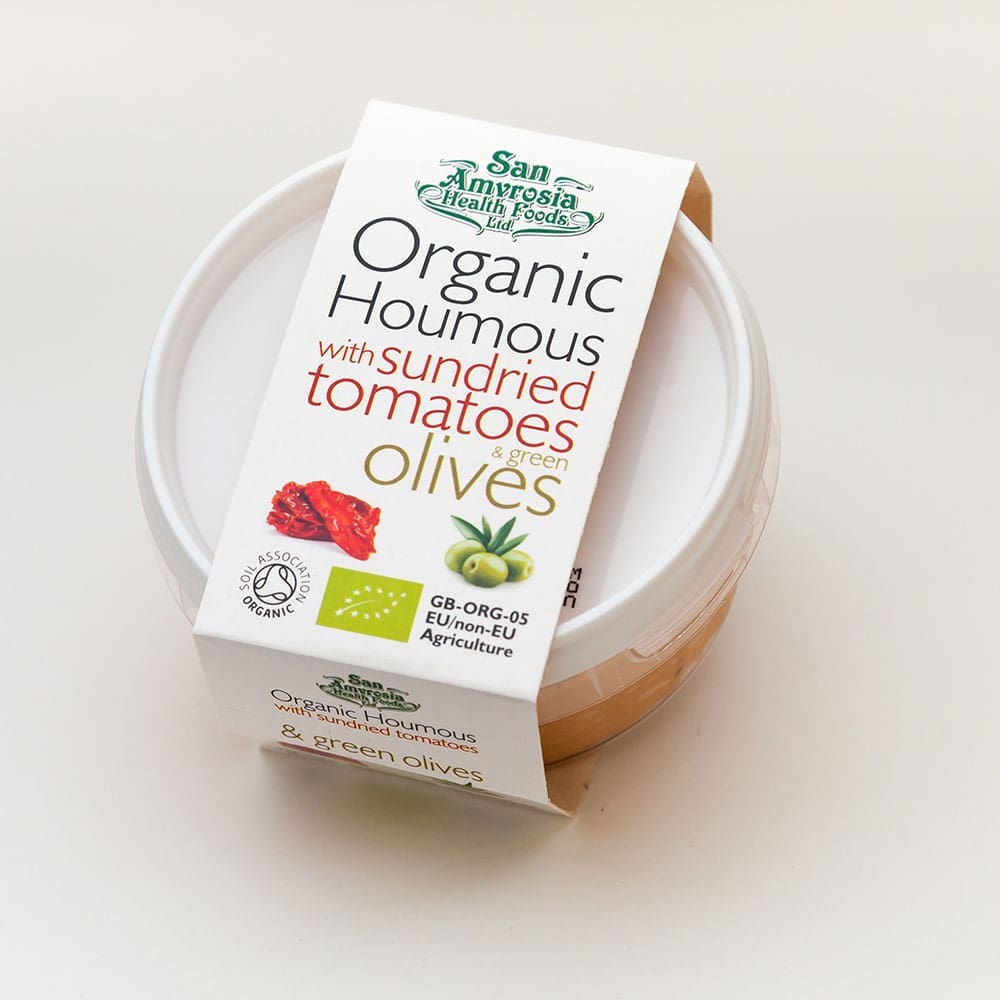 Organic Chickpeas, Water, Organic Sunflower Oil, Organic Tahini, Lemon Dressing (Water, Lemon Juice made from Fresh Organic Lemons, Citric acid), Organic Sun Dried Tomatoes, Organic Green Olives, Sea Salt, Organic Garlic