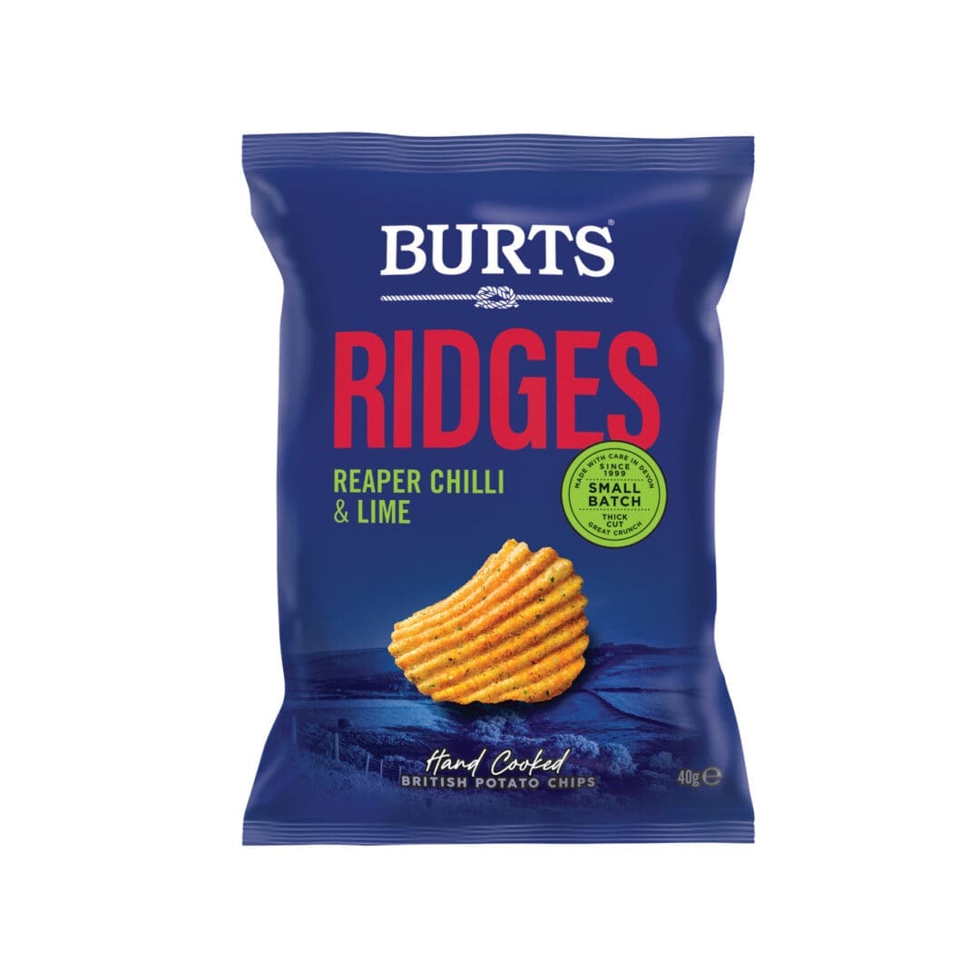 Burts Ridges Reaper Chilli and Lime Crisps offer a bold flavour with ridge cut texture, combining fiery Carolina Reaper chilli and refreshing lime. Supplied in 20x40g packs.