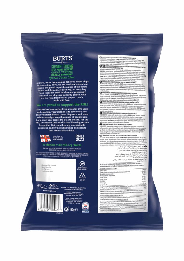 Burts Salt and Vinegar Crisps 10x150g deliver a classic tangy, crunchy snack ideal for cafés and retailers seeking quality crisps with authentic flavour.