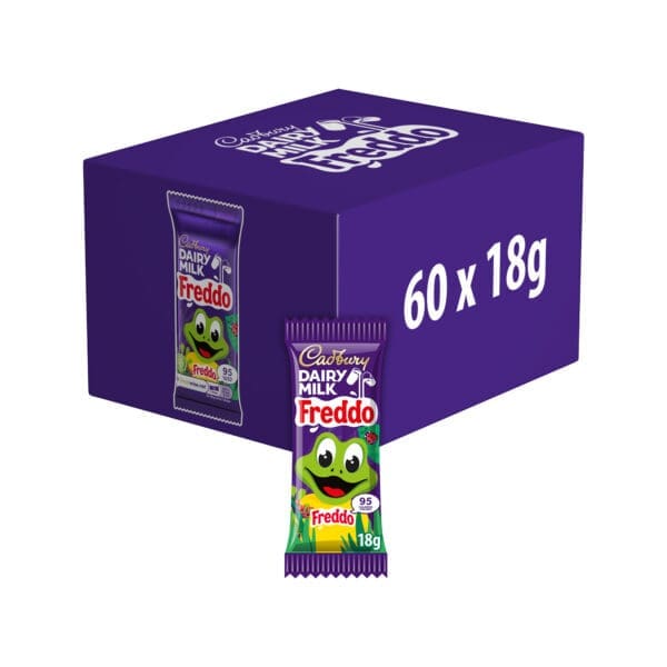 Cadbury Freddo chocolate bars in a 1x60 pack. Classic creamy Dairy Milk chocolate frogs, ideal for retail displays and impulse purchase points.