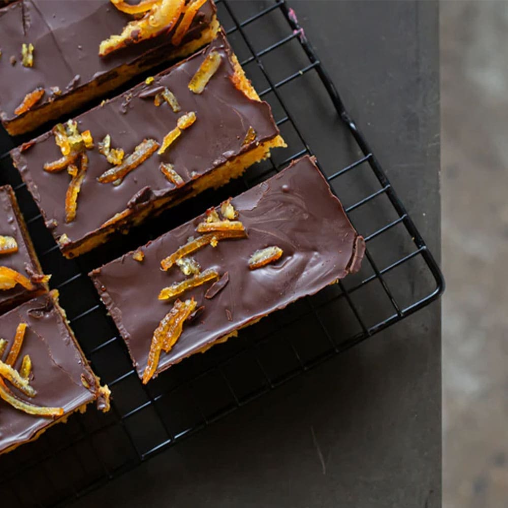 Dark chocolate 15% (cocoa mass, sugar, fat-reduced cocoa powder, emulsier (sunower lecithin), natural vanilla avouring), coconut oil, sugar, apple and orange jelly pieces 10% (apple puree, orange juice, humectant (glycerol), fructose glucose syrup, glucose syrup, WHEAT bre (gluten <20ppm), sugar, rice starch, sustainable palm fat, gelling agent (pectin), acidity regulator (citric acid), natural orange avouring, antioxidant (ascorbic acid), colour (curcumin)), SOYA drink (water, SOYA beans, sugar, natural avouring, stabiliser (gellan gum)), ground ALMONDS, polenta, pasteurised orange comminute 6%, dark chocolate chunks 6% (cocoa mass, sugar, cocoa butter, emulsier (SOYA lecithin), natural vanilla avouring), vegetable fat spread (vegetable oils (sunower, rapeseed), coconut oil, water, sea salt, faba bean preparation, emulsier (sunower lecithin), natural avouring, colour (carotenes)), orange zest 2%, candied orange peel 2% (orange peel, surcose, fructose, dextrose, maltose, preservatives (potassium sorbate, sodium metabisulphate), acidity regulator (citric acid)), ground ax seeds, raising agents (mono calcium phosphate, sodium bicarbonate), corn starch)), salt, thickener (xanthan gum), orange oil.