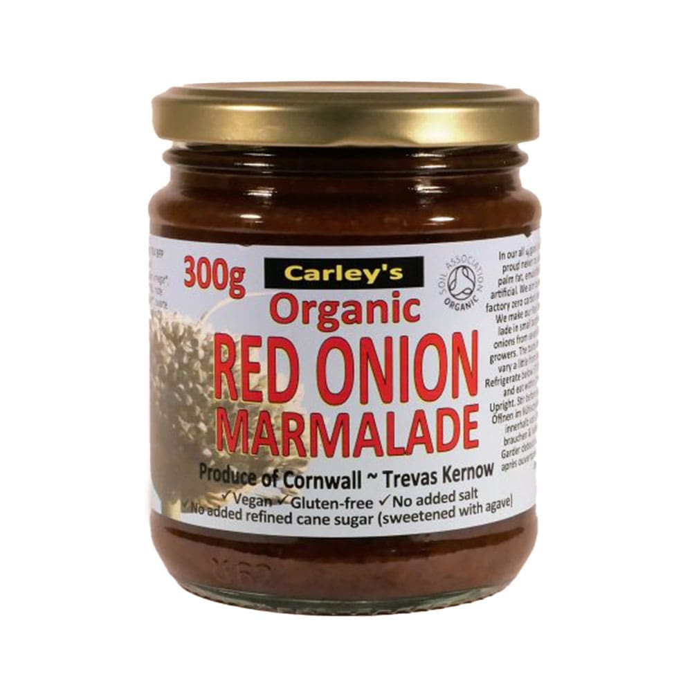 Carleys Organic Red Onion Marmalade is a rich, tangy preserve crafted from fresh organic red onions and a blend of natural spices. Presented in 300g jars, it is perfect for enhancing cheeses and meats in professional kitchens.