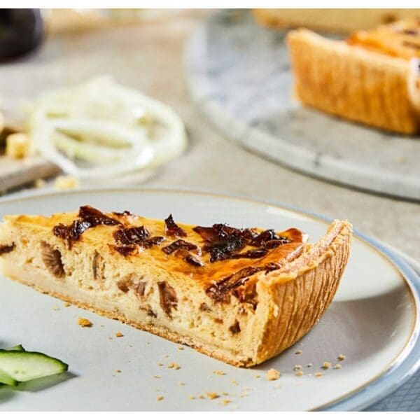 A fully baked 10" quiche combining cheddar cheese and balsamic red onion. Perfect for catering, ready to serve as a snack or light meal.