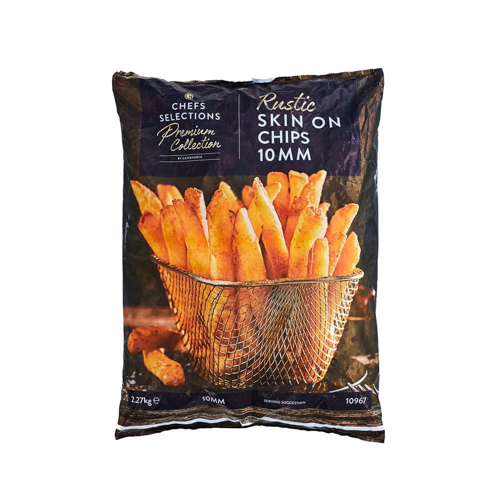 Chef's Selection Premium Rustic 10mm Fries offer golden, skin-on chips with a crisp exterior and fluffy inside. Supplied in 1x2.27kg packs, ideal for professional kitchens.