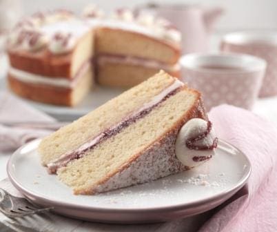 Chefs' Selections Victoria Sponge Cake features a delicate sponge with raspberry jam and buttercream, perfect for cafés and catering service needs in a 14 portion pack.