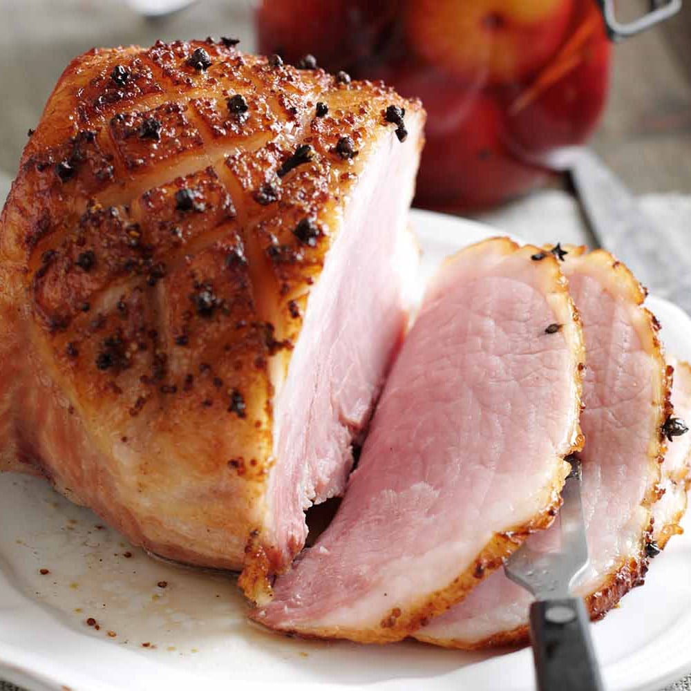 Cider Cured Ham simmered in apple cider, glazed with honey mustard and calvados for a crisp skin. Ideal for roasting and versatile serving options.