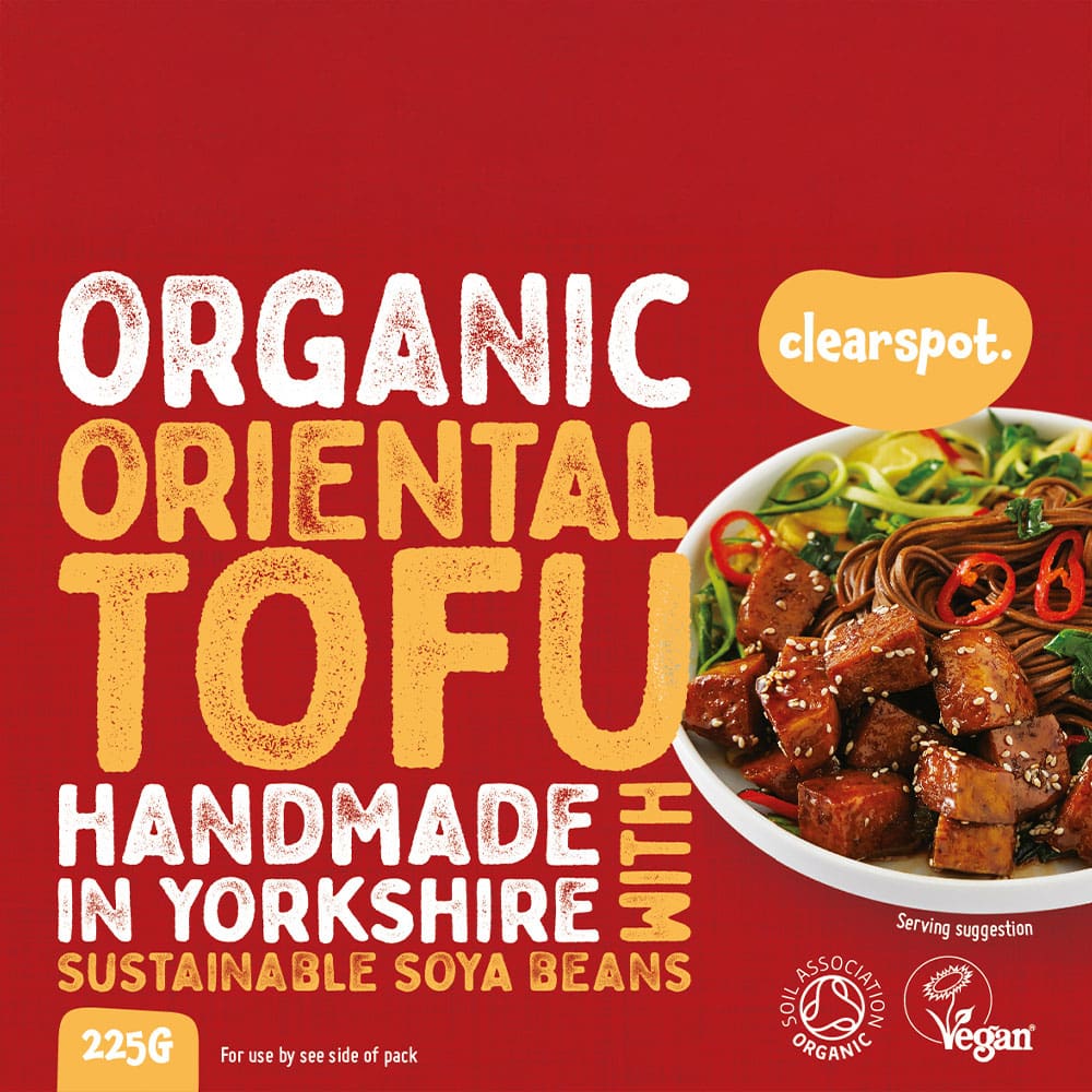 Clearspot Organic Oriental Tofu, handcrafted in North Yorkshire, offers an extra-firm texture ideal for cooking, salads, and grilling. Supplied in 225g packs.