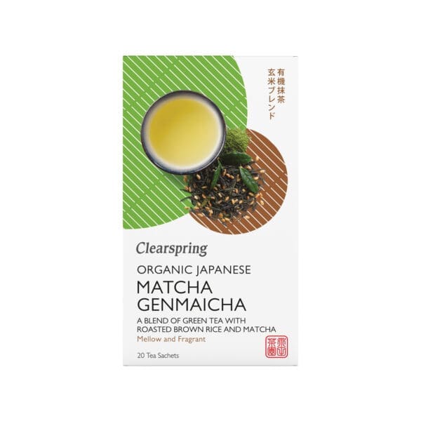 Clearspring Organic Japanese Matcha Genmaicha Green Tea offers a unique blend of matcha and roasted rice, perfect served hot or cold. Available in 4x20 bags.