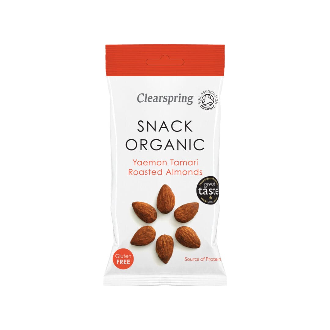 Clearspring Organic Tamari Roasted Almonds offer a crunchy texture with a deep umami taste, ideal for enhancing menus or premium retail displays in 15x30g packs.