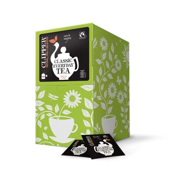 Clipper Fairtrade Tea String and Tagged combines rich African and Indian teas to deliver a classic full flavour. Supplied in 6×100 packs, ideal for cafés and catering.