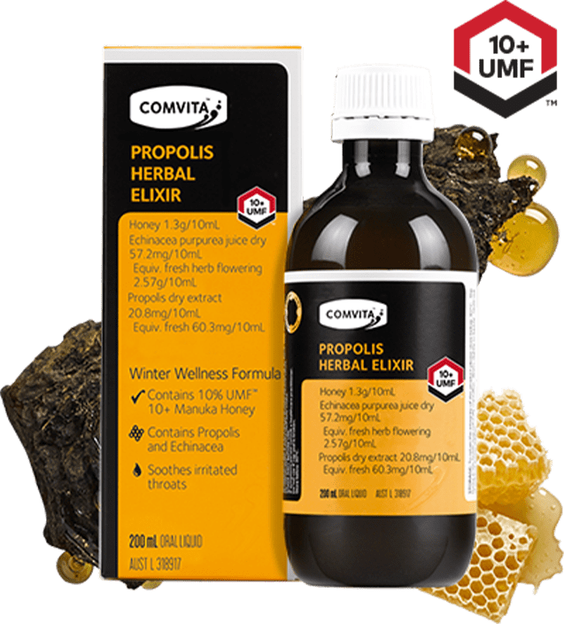 Comvita Propolis Herbal Elixir with Manuka honey soothes irritated throats and eases cold symptoms. Ideal for natural, effective relief in a 200ml bottle.