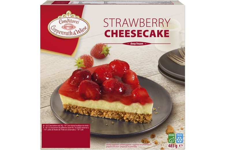 Coppenrath Strawberry Cheesecake offers a creamy, fruity dessert with whole strawberries on a rich cheesecake and crunchy biscuit base. Ideal for chilled service.