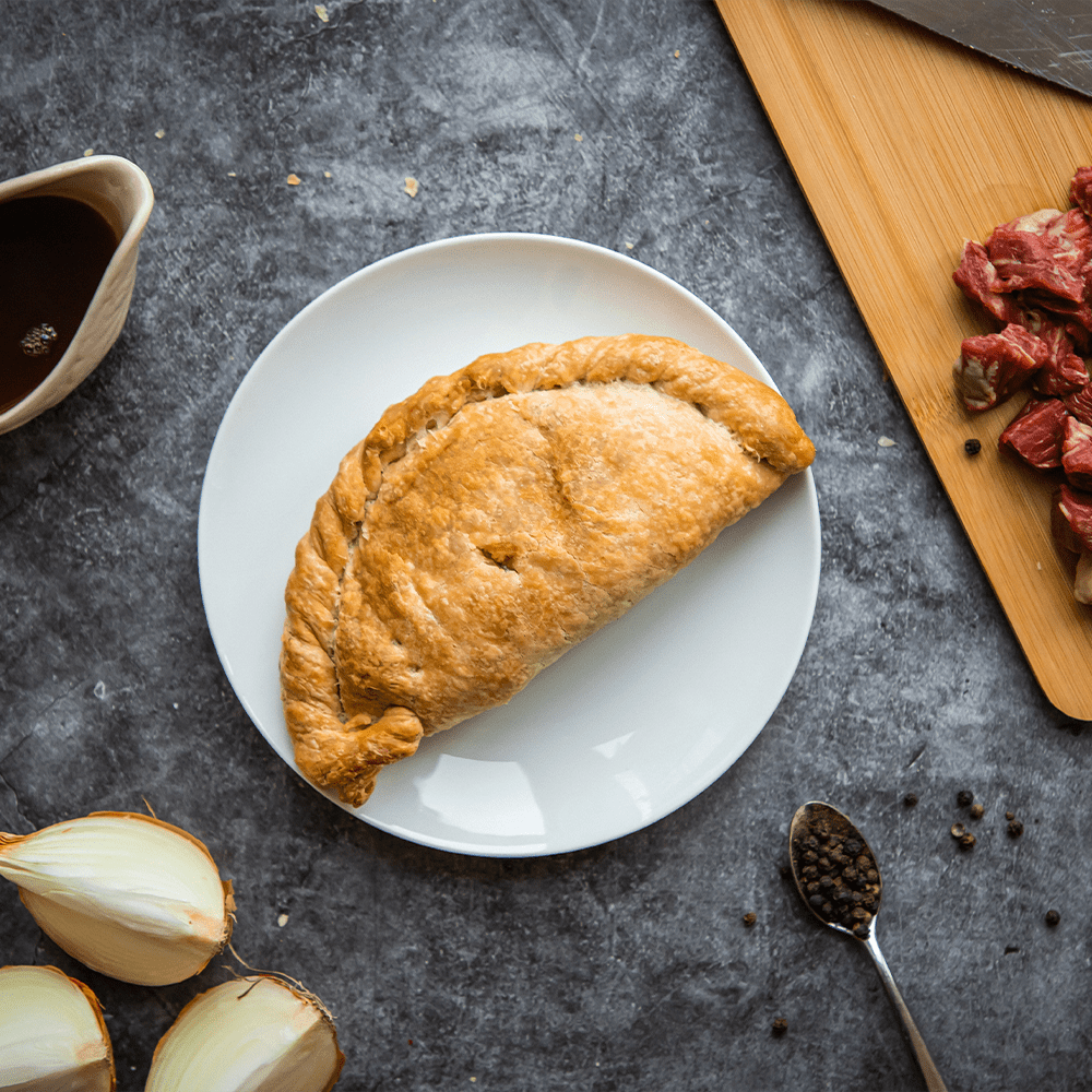 Cornish Premier Steak & Gravy Pasty features tender beef in rich onion gravy with potato and herbs, perfect for a hearty, traditional meal. Unbaked, 30x283g.
