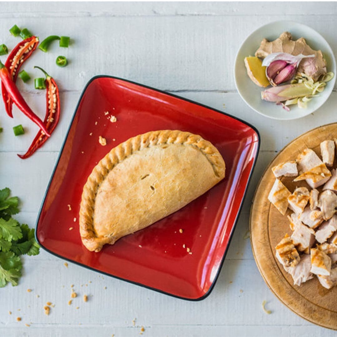 Cornish Premier Thai Red Chicken Pasty features tender chicken with lemongrass and Thai spices in a crisp pastry. Ideal for a quick, flavourful serving in food menus.