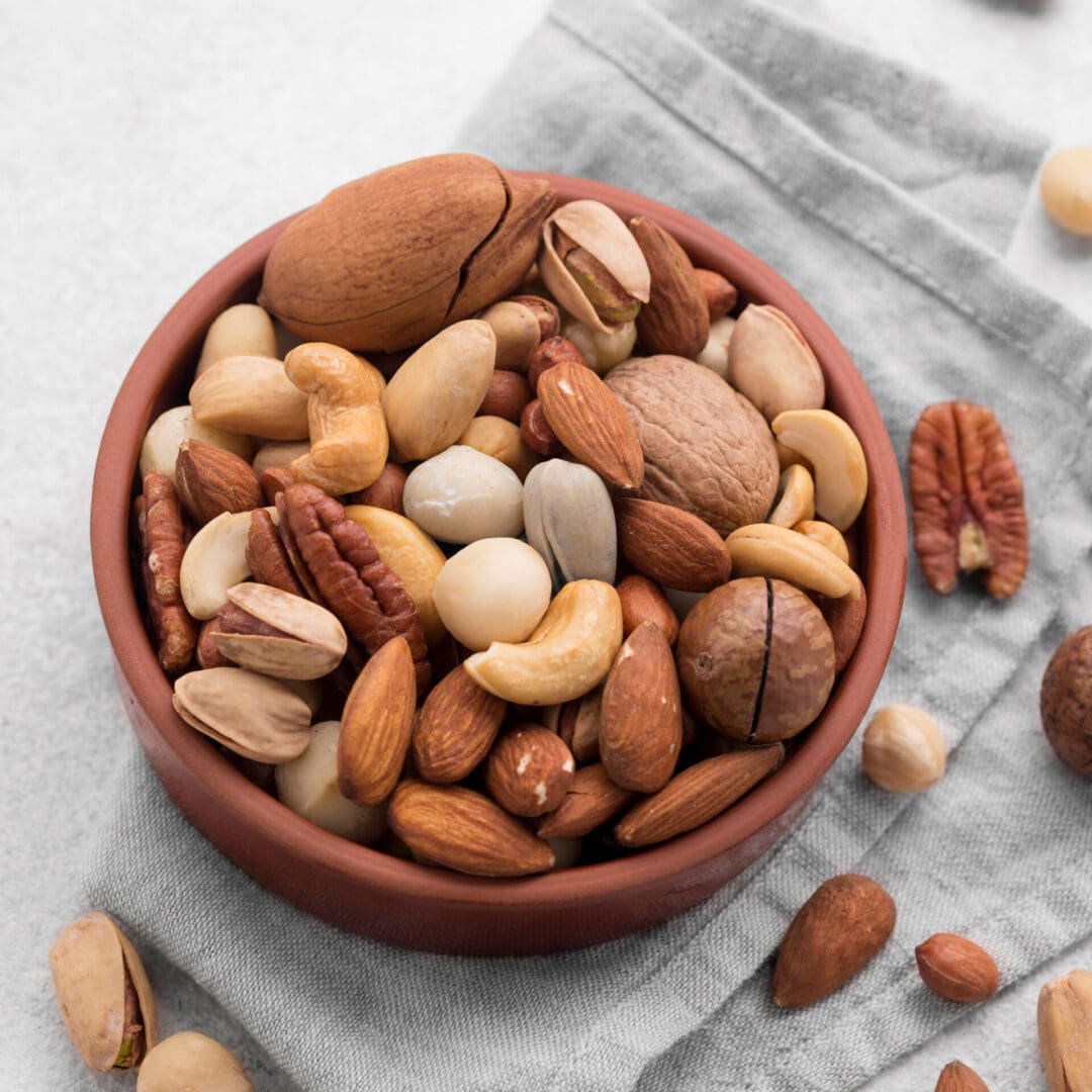 Premium deluxe mixed nuts with peanuts, featuring Brazil nuts, cashews, almonds, hazelnuts, walnuts and pecans. Perfect for snacking or recipe enhancement in foodservice.