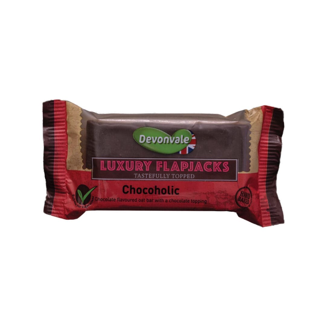 Devonvale Chocoholic Flapjack is a rich chocolate flapjack featuring chocolate chips and fudgice. Perfect for cafés and retailers seeking an indulgent sweet option in 24-bar packs.