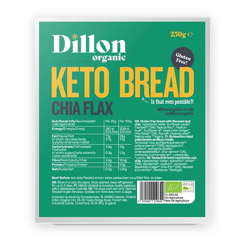 Ingredients: Water, Sunflower seeds*, Flaxseed* (13%), Tapioca flour*, Psyllium husk*, Chia Seeds* (2%), Sunflower oil*, Apple cider vinegar*, Sea salt, Caraway seed*, Baking soda *=Organic