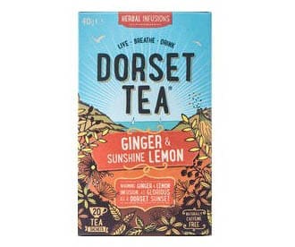 Discover Dorset Tea Ginger and Lemon, a soothing herbal blend combining warming ginger with fresh lemon. Presented in 4x20 bags, ideal for serving hot or iced.
