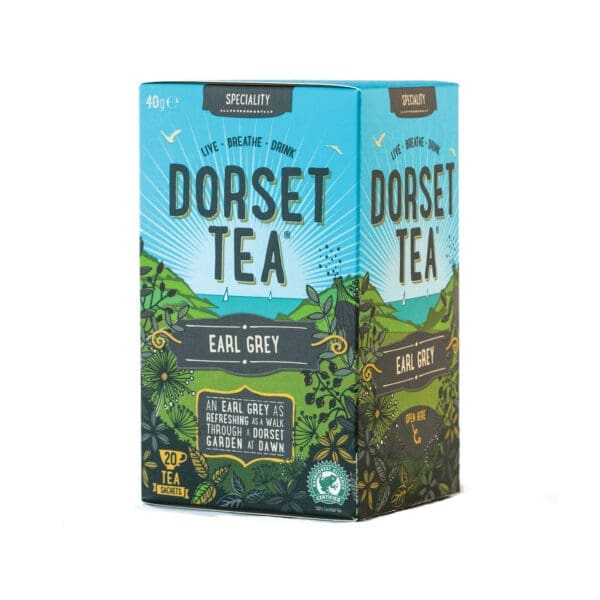 Dorset Tea Earl Grey blends quality black tea with fresh citrus and zesty bergamot in biodegradable sachets, ideal for a refreshing cup.