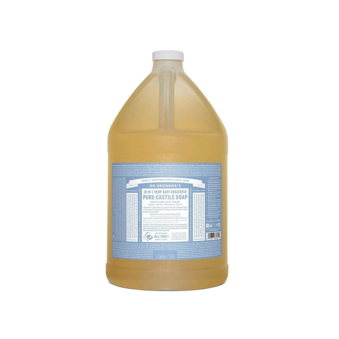 Dr Bronners Baby Liquid Soap is fragrance-free with double olive oil, ideal for sensitive skin and multiple cleaning uses. Available in 3.79 litres.