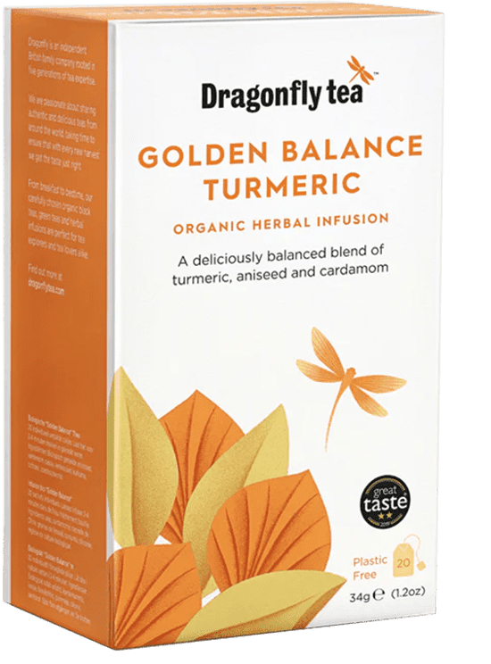Dragonfly Organic Golden Balance Turmeric Tea is a gluten free, vegan blend of warming herbs and spices. Enjoy its soothing, detoxifying qualities daily in convenient 4x20 biodegradable teabags.