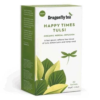 Dragonfly Organic Happy Times Tulsi Tea features four packs of 20 biodegradable bags, offering a soothing blend of tulsi, hemp, lemon balm and spearmint, perfect for hot or iced service.