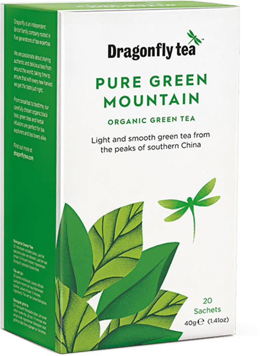 Dragonfly Organic Pure Mountain Green Tea features 20 biodegradable teabags from Southern China, offering a fresh, natural flavour ideal for premium tea service.