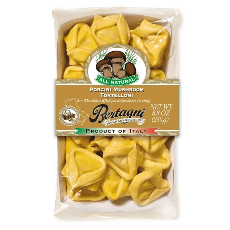 Filling (55%): Sauteed Mushrooms 25% (Champignons 37% (Agaricus Bisporus), Porcini Mushroom 26% (Boletus Edulis and Allies), Onion, Sunflower Oil, Parsley, Salt, Dried Porcini Mushroom (Boletus Edulis and Allies), Pepper, Garlic), Ricotta Cheese (MILK Whey, Cream (MILK), Salt), Breadcrumbs (WHEATFLOUR (contains GLUTEN), Salt, Yeast), Sunflower Oil, Butter (MILK), Hard Grated Cheese (MILK), Salt, Natural Aroma, Summer Truffle (0.5%) (Tuber Aestivum), Pasta (45%): Soft WHEATFLOUR (contains GLUTEN), EGG (28.5%), Durum WHEAT Semolina (contains GLUTEN)
