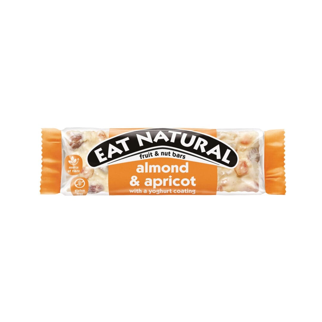 Yoghurt flavour coating 30% (vegetable fats (palm kernel, palm), MILK whey, sugar, dried yoghurt (MILK), emulsifier: sunflower lecithin), dried apricots 17% (apricots, rice flour), shredded coconut 14%, glucose syrup, crisped rice (rice flour, rice bran, sugar), ALMONDS 10%, honey 5%.