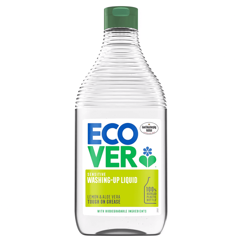 Ecover Lemon and Aloe Vera washing up liquid cleans dishes effectively with plant-based ingredients. Comes in a 450ml recycled bottle for eco-friendly use.