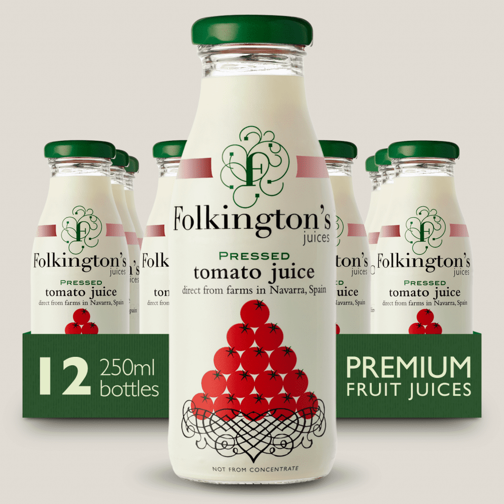 Folkingtons Tomato Juice offers pure pressed juice from late-harvested tomatoes grown in Spanish farming communities, presented in 12x250ml packs for versatile culinary and drink applications.