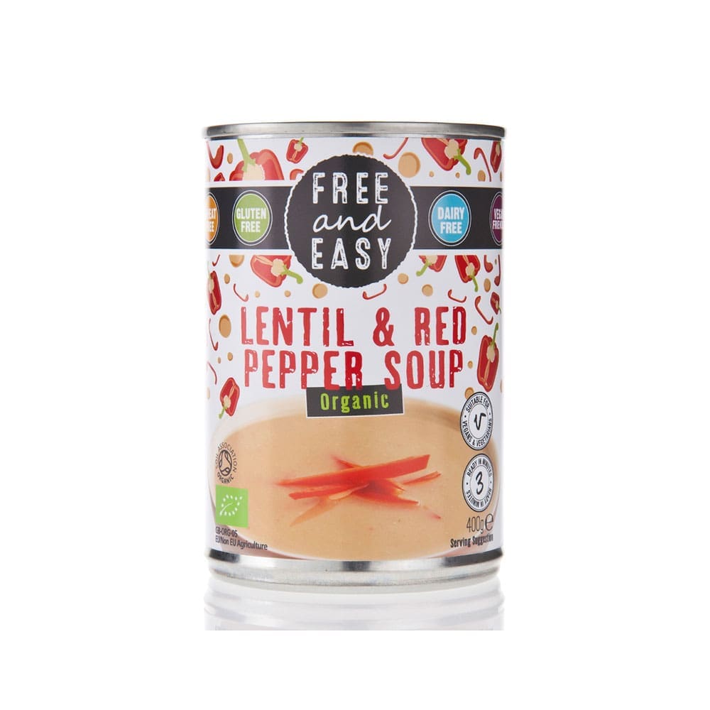 Organic Lentil & Red Pepper Soup, ready to serve in a 400g ambient pack. Ideal for quick, healthy meals packed with flavour and nutrition.