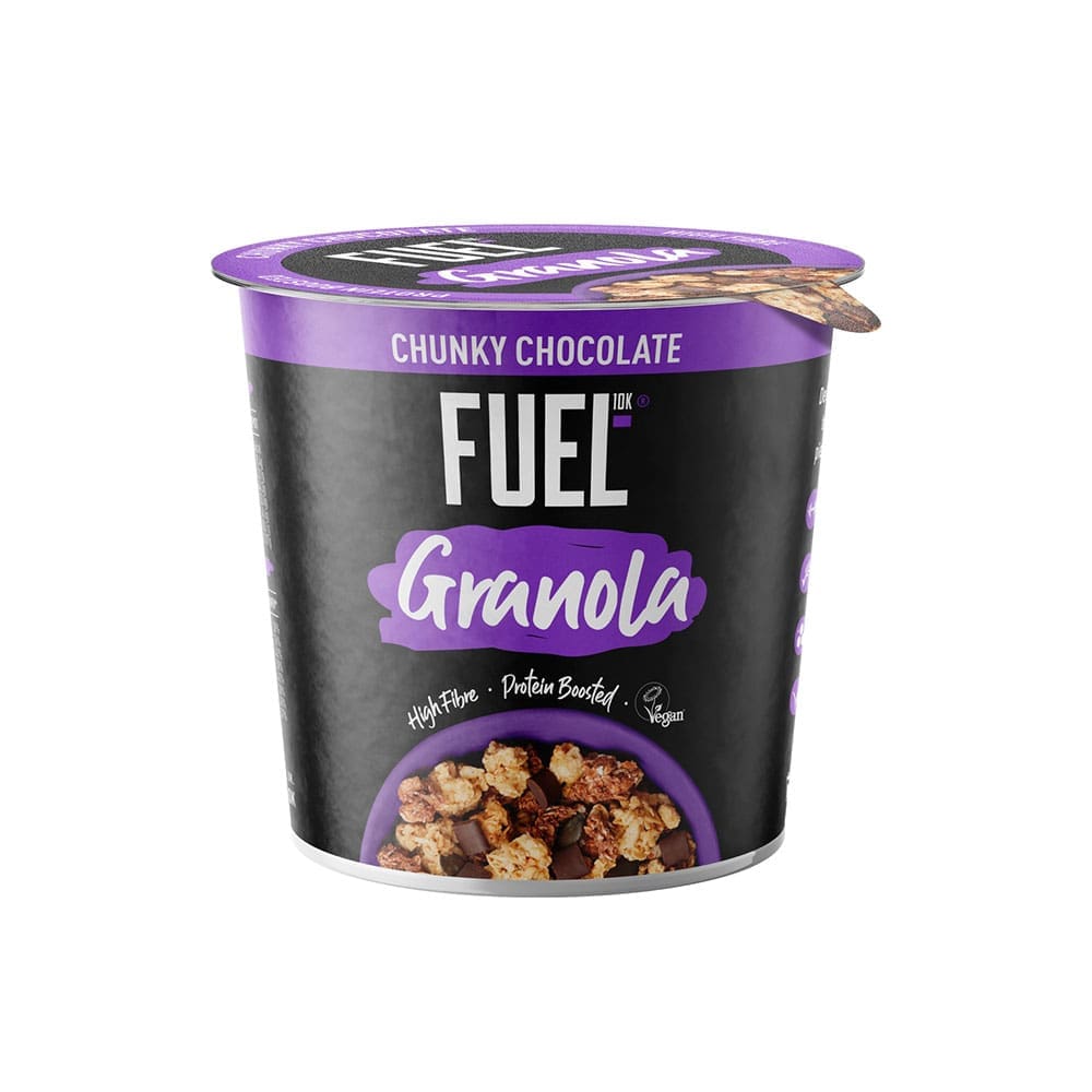 Fuel 10K Chocolate Granola Pot offers a tasty and convenient 70g snack pot with chunky clusters, chocolate pieces, and pumpkin seeds. Ideal for quick, energising servings.
