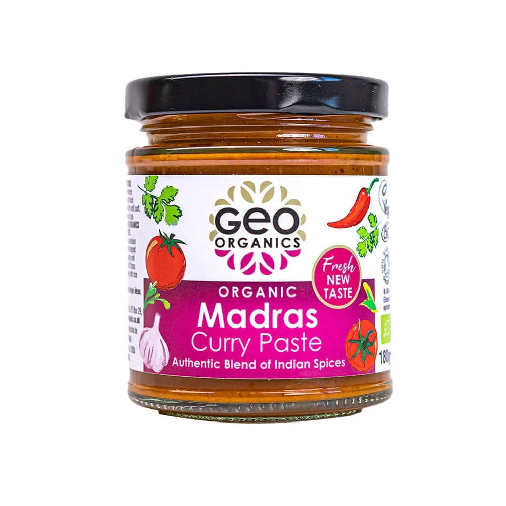 Geo Organics Madras Curry Paste offers rich, authentic Indian flavours in a convenient 180g pack. Ideal for professional kitchens requiring reliable and premium cooking sauces.