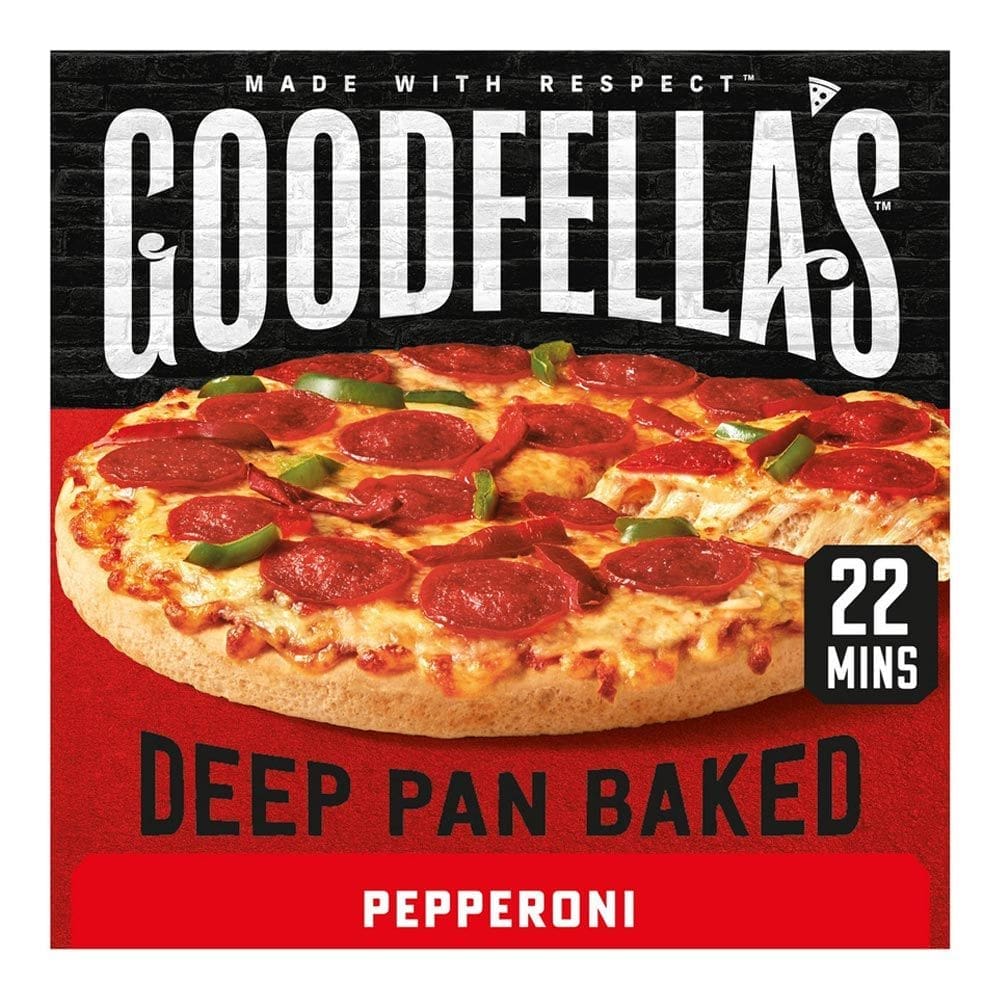 Goodfellas Deep Pepperoni Pizza 7x411g packs provide a ready-to-bake option topped with tomato sauce, mozzarella, smoked pepperoni, and red & green peppers on a deep pan base, ideal for diverse menus.