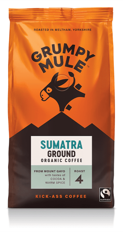 Grumpy Mule Organic Sumatra Coffee features rich cocoa and dark chocolate notes. Perfect for espresso or drip brews in premium hospitality settings. Packaged in 6x200g.