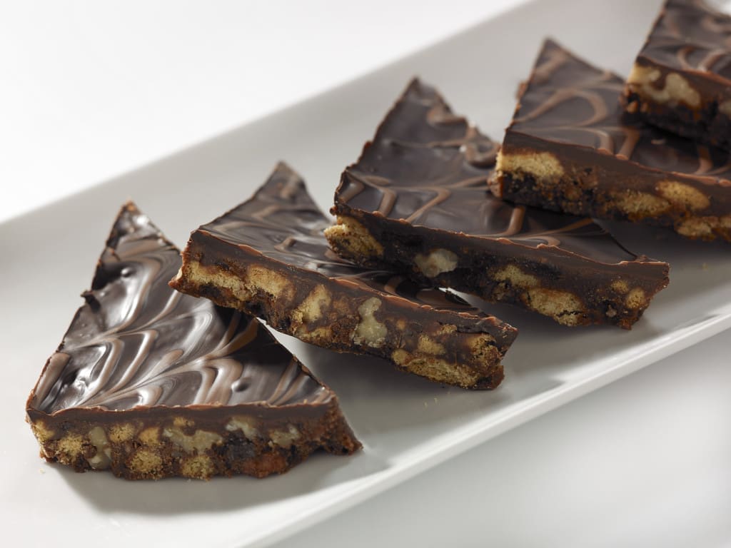 Handmade chocolate fruit & nut traybake featuring a luscious chocolate fudge base with crunchy walnuts and sultanas, finished with dark chocolate. Supplied 1x12ptn.