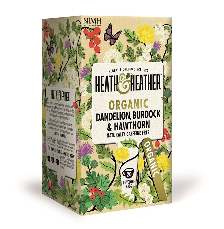 Heath & Heather Organic Dandelion Burdock Hawthorn Tea delivers a naturally caffeine-free blend featuring herbal benefits and heart tonic properties. Packaged as 6x20 bags.